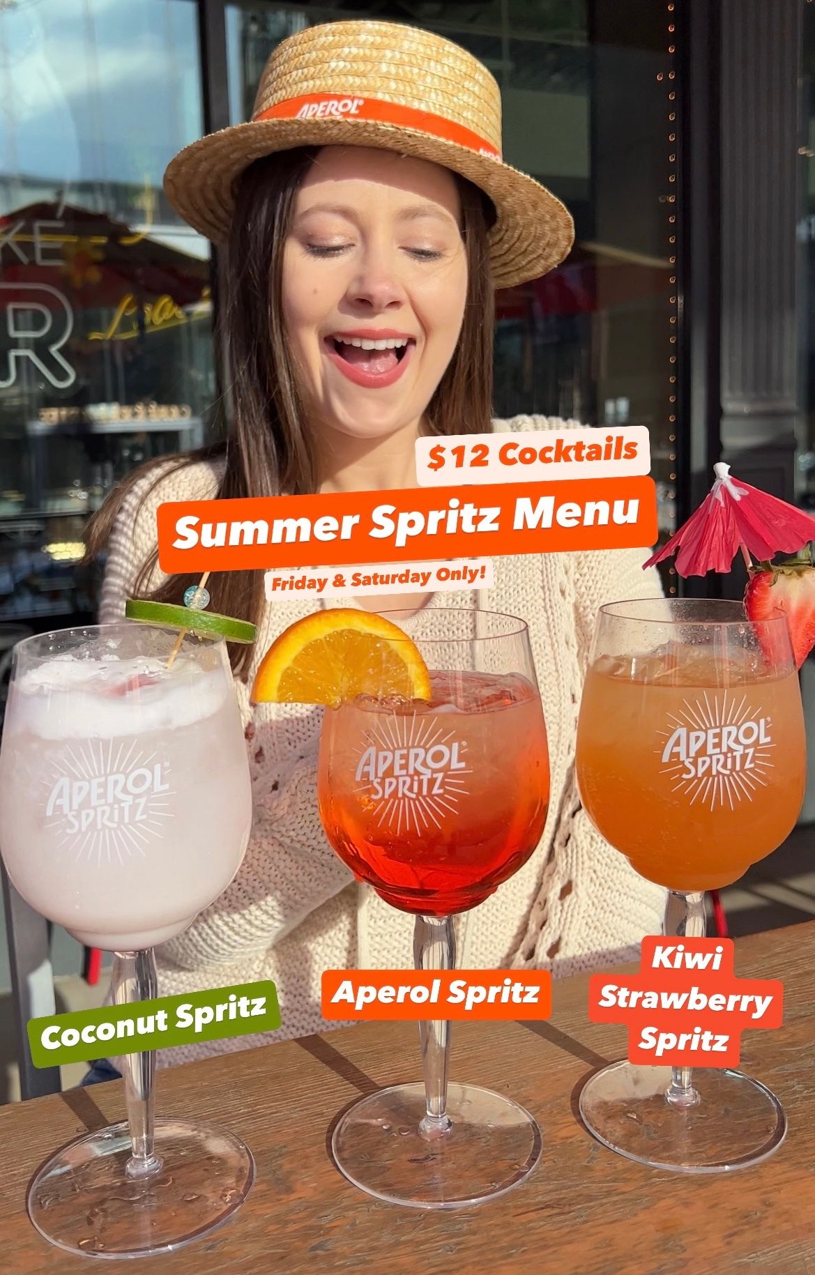One of the highlights? A seasonal Summer Spritz Menu with three $12 cocktails (pictured above): Aperol Spritz, Coconut Spritz and Kiwi Strawberry Spritz.