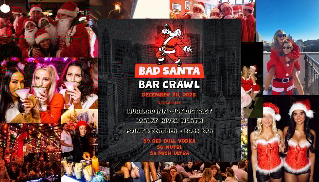 Bad Santa Bar Crawl: A one-day holiday bar crawl is taking over River North in exactly one month. On Saturday, Dec. 20 from 3 p.m. to 9 p.m., West Hubbard Street will turn into a wild Christmas celebration for The Official BAD SANTA Christmas Bar Crawl.
